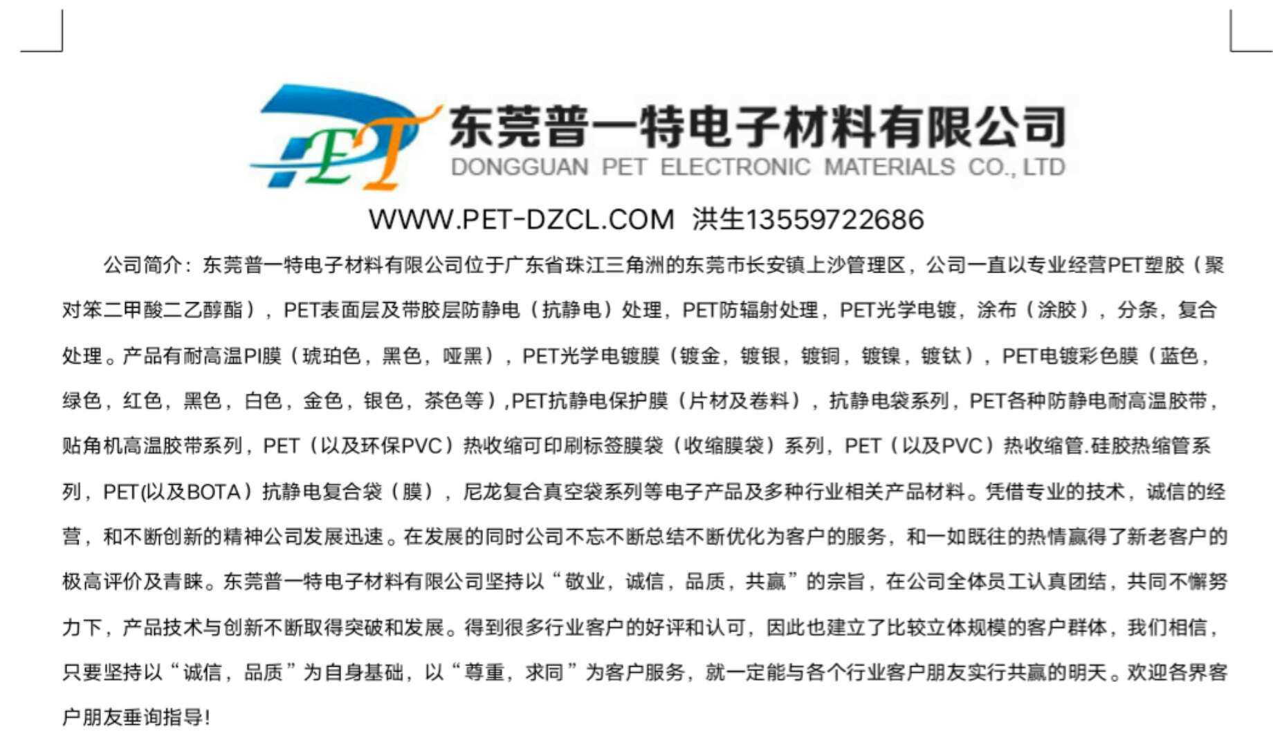抗静电耐高温PET卷料/片材颜色有 :红色、蓝色、黄色、黑色、金黄色、绿色半透明等。产品有着优良的韧性、高透明性,以及可回收再生利用,燃烧不产生有害气体的优异环保性能。采用高分子导电聚合物涂覆技术,性能稳定,不受环境温湿度的影响。PET保护膜分为硅胶型抗静电保护膜和亚克力胶型抗静电保护膜两种,其中亚克力胶抗静电型完全可以做为NITTO RP301替代品使用,硅胶型抗静电保护膜再具有抗静电功能的同时还具有硅胶的良好耐高温性能以及高耐候性,低粘着且容易撕取,不残胶,高透明度。PET耐高温抗静电膜特点:有优良的透明性与光洁度。.表面装饰性能优良,不经过表面处理即可印刷,易压制花纹,易金属化处理(真空镀敷金属层)。有良好的力学强度。对氧气及水蒸汽的阻隔性能好。耐化学性能好,可经受多种化学物质的侵蚀。无毒,卫生性能可靠,可用于食品,药物及医疗器材的包装。对环境保护的适应性好,可经济而方便地回收利用,焚烧废物时不产生危害环境的有害物质。热成型性能好,被认为是符合环境保护要求的一种理想的包装材料。采用高分子导电聚合物涂覆,表面电阻率低,性能稳定,不受环境温湿度的影响。比重轻:PET比重1.33比PVC比重1.38低3.7%.。强度高:PET片材强度比PVC片材高20%以上,耐低温冲击性能更佳,能耐—40%C而不脆裂。耐折性好:PET片不会出现PVC那样的自裂纹折痕,适合用于文件等表面装璜。.PET片材透明度高(PVC片材偏蓝色),尤其光泽比PVC片材好,适合精美包装。东莞普一特电子材料有限公司 可依据客户要求规格及颜色定制。